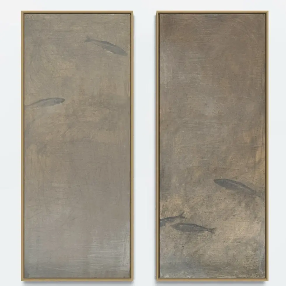 Original Paintings, 2025 / Mixed Medium on Panel, Encaustic, Matte or Gloss Finish / Framed in Maple Hardwood / Available individually or as a diptych. / Size: 16 × 40 × 2 Inches each / Tones of Wet Sand, Crushed Shell, and Stone